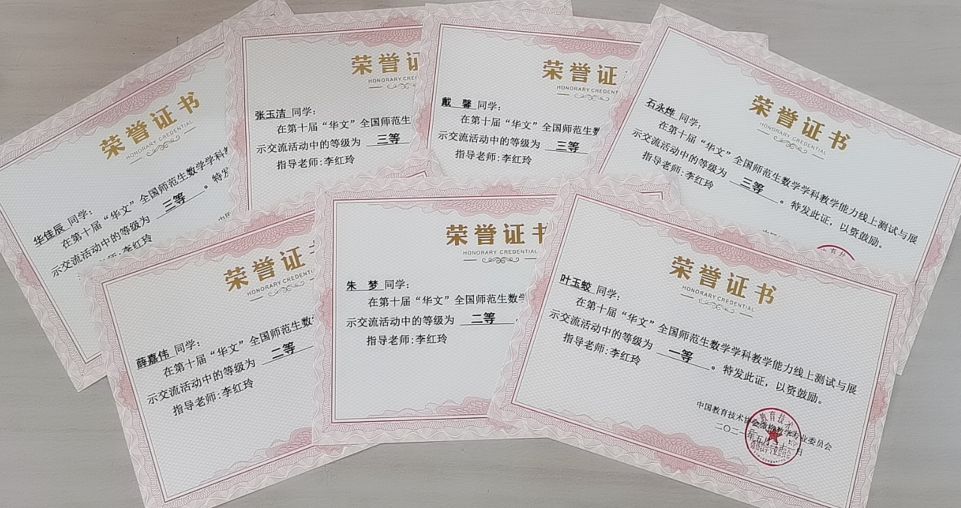 4月24日至5月31日,2021年第十届“华文”全国师范院校数学师范生数学创课能力线上测试与展示交流活动圆满落幕。文理学院数学系积极组织学生参赛,2018级、2019级7名同学参加两个阶段的激烈角逐,所有选手皆斩获奖项,其中叶玉蛟获一等奖、薛嘉伟、朱梦获二等奖、石永烨、张玉洁、华佳辰、戴馨获三等奖。本次大赛由中国教育技术协会微格教学专业委员会主办,广西师范大学大学承办,有南京师范大学、广西师范大学、重庆师范大学、南京晓庄学院、江西师范大学等全国58所高校、382名选手参加此项活动。