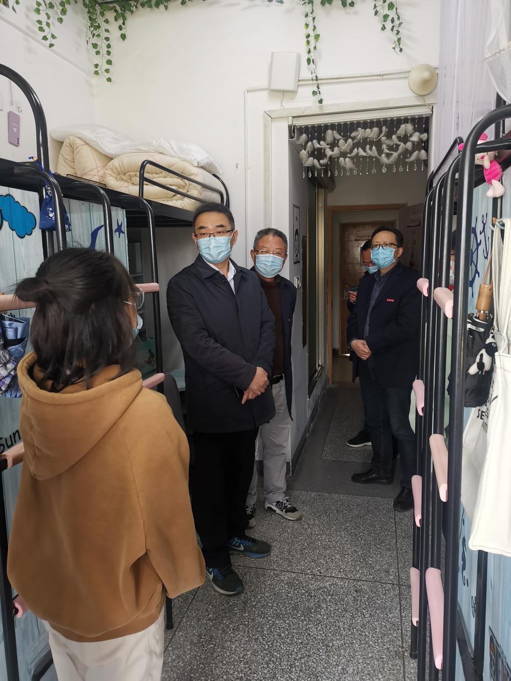 副校长潘志明先后到“十个一”所联系的班级、宿舍开展走访,了解学生线上学习、日常生活和考研考编情况。每到一间宿舍,他都与同学们亲切交谈,并表示学校会不断为同学们创造良好的学习生活环境,努力解决大家在日常学习生活中的实际问题。他语重心长地提醒同学们,在校期间要高度重视疫情防控工作,按要求参加核酸检测;要注意饮食卫生和食品安全,做好个人防护;要积极进取,在“危”中求“机”,扎实学习专业知识,拼搏成就美好未来。